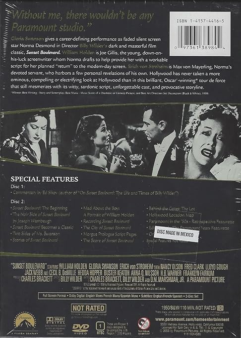 The Centennial Collection s edition of Sunset Boulevard includes a second disc of supplementary materials that deserves a review of its own. Over 16 biopics, short documentaries, still photo galleries, and more offer viewers the chance to look at Wilder s masterpiece through a scrupulous critical lens. These extras will appeal to not only fans who want behind-the-scenes anecdotal gossip but also to those interested in how the film was made and the movie industry climate during the making of this "movie about the movies," as author Joseph Wambaugh calls it in his featurette, "The Noir Side of Sunset Boulevard." For fans of the actors there are two glimpses into the stars personal lives and careers, "Two Sides of Gloria Swanson" and "Mad About the Boy: Portrait of William Holden." Though archival interview footage of Gloria Swanson is more ample in the short "Sunset Boulevard Becomes A Classic," "Two Sides" features Swanson s granddaughter, Brooke Anderson.