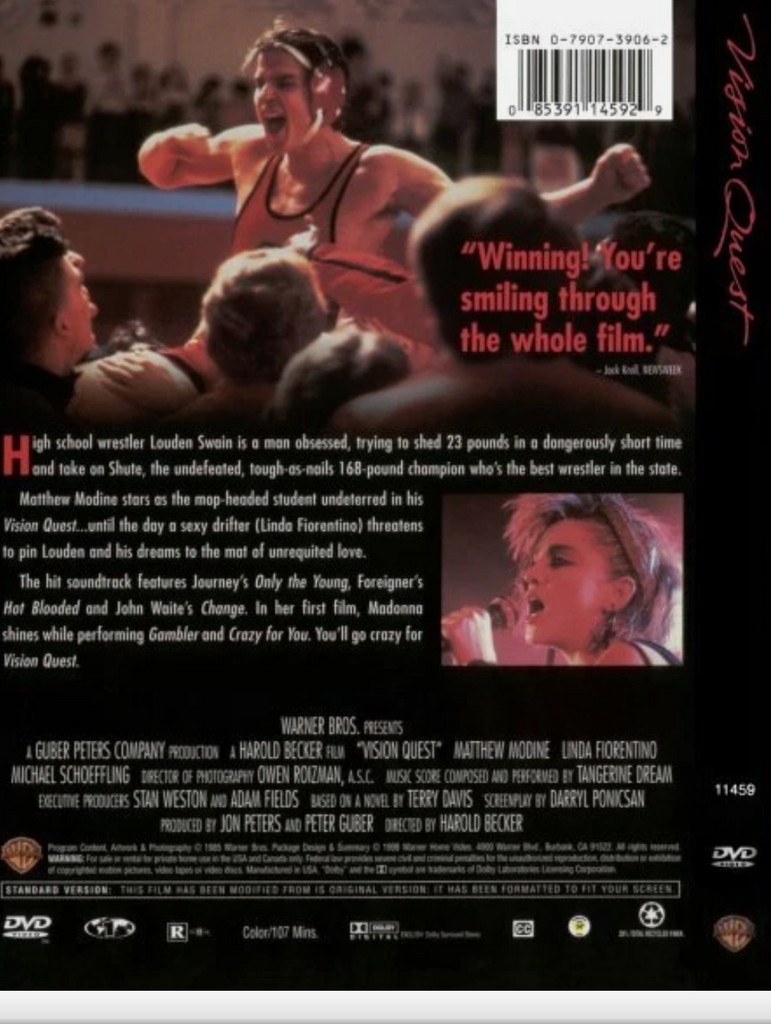 Vision Quest is a coming of age movie in which high school wrestler Louden Swain (Matthew Modine) decides he wants to be something more than an average high school athlete and sets his sights on a prize that many don't think he can win -- he then sets out to reach his goal alone, without much support from his father or coach. His father rents a room to a young drifter, Carla (Linda Fiorentino). Swain falls in love with her and she helps him stay focused and prevents him from losing sight of his goals. Although a lower-budget film than Flashdance or Top Gun, this movie is similar in theme and style. Madonna makes her first appearance in a major motion picture as a lead singer in a local band performing her hit songs "Crazy For You" and "Gambler".